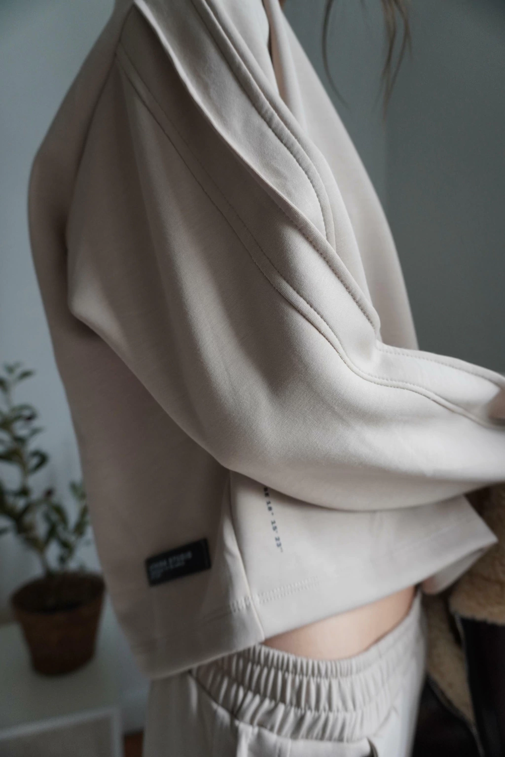 Buzo Hoodie de tela deportiva con detalles de costura simil alerones. Avios y estampa personalizada de marca Athina Studio™. Medidas de la modelo: Estatura 172cm / Cintura 60cm / Busto 85cm / Cadera 92cm. La modelo está usando talle Small.