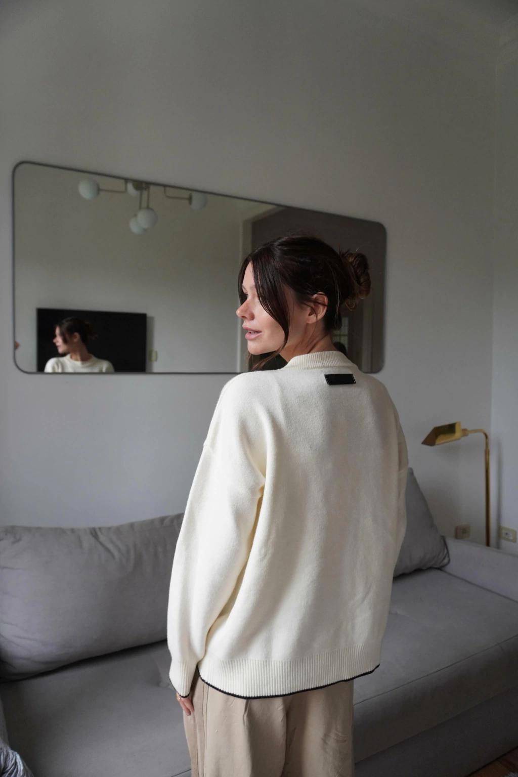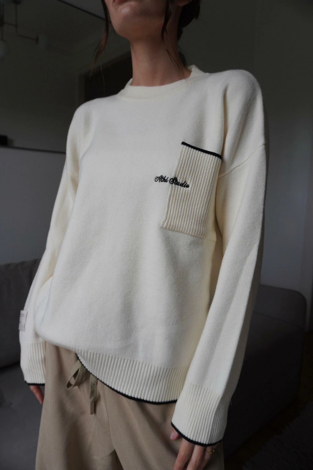 Sweater con vivos en contratono. Avios personalizados de marca Athina Studio™. Medidas de la modelo: Estatura 172cm / Cintura 60cm / Busto 85cm / Cadera 92cm.