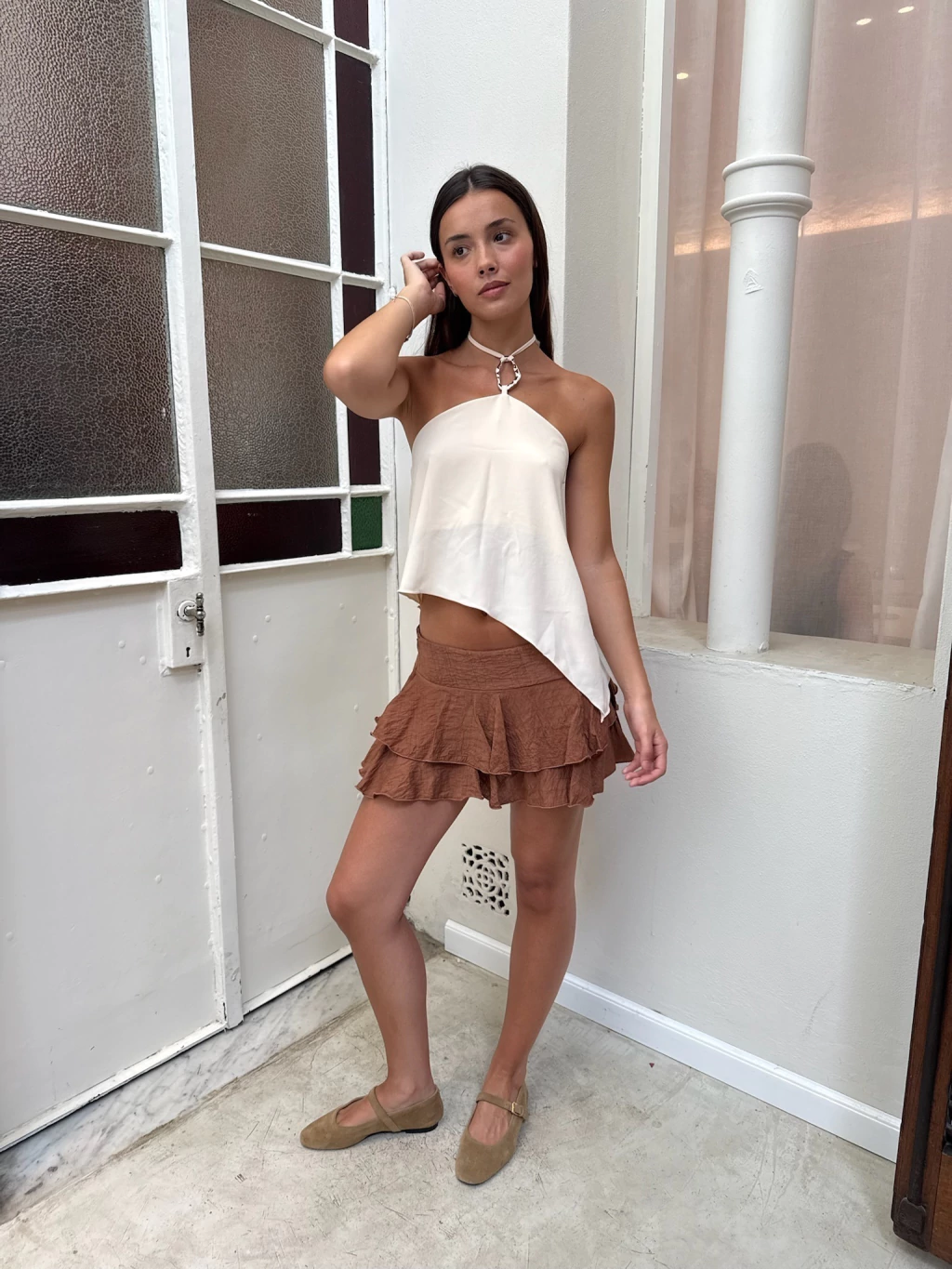 Top gasa con avio central. Avios personalizados de marca Athina Studio™. Medidas de la modelo: Estatura 172cm / Cintura 60cm / Busto 85cm / Cadera 92cm. La modelo está usando talle Small.